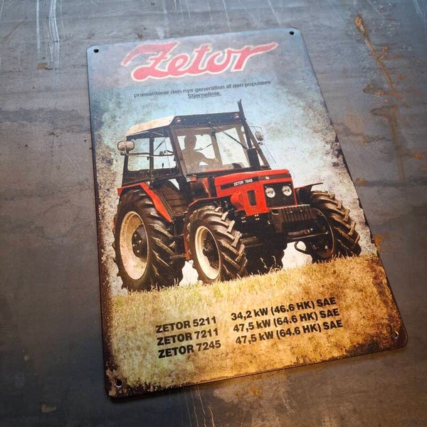Metalen wandplaat van Zetor met verschillende types. Afmeting is ongeveer 20 cm x 30 cm. Voorzien van 4 gaatjes om hem op te hangen.