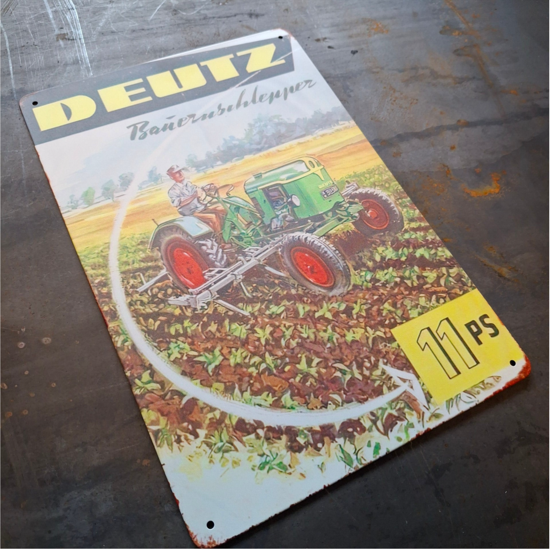 Metalen wandplaat van de Deutz 11 PS Oldtimer. Afmeting is ongeveer 20 cm x 30 cm. Voorzien van 4 gaatjes om hem op te hangen.