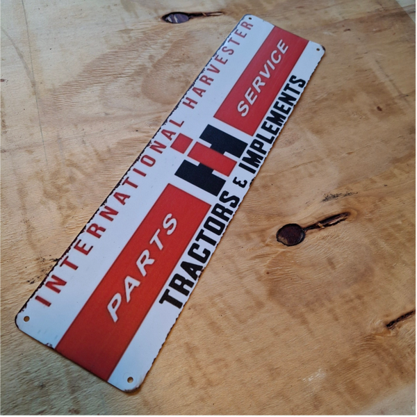 Metalen wandplaat van International Harverster parts & service. Afmeting is ongeveer 40 cm x 10 cm. Voorzien van 4 gaatjes om hem op te hangen.