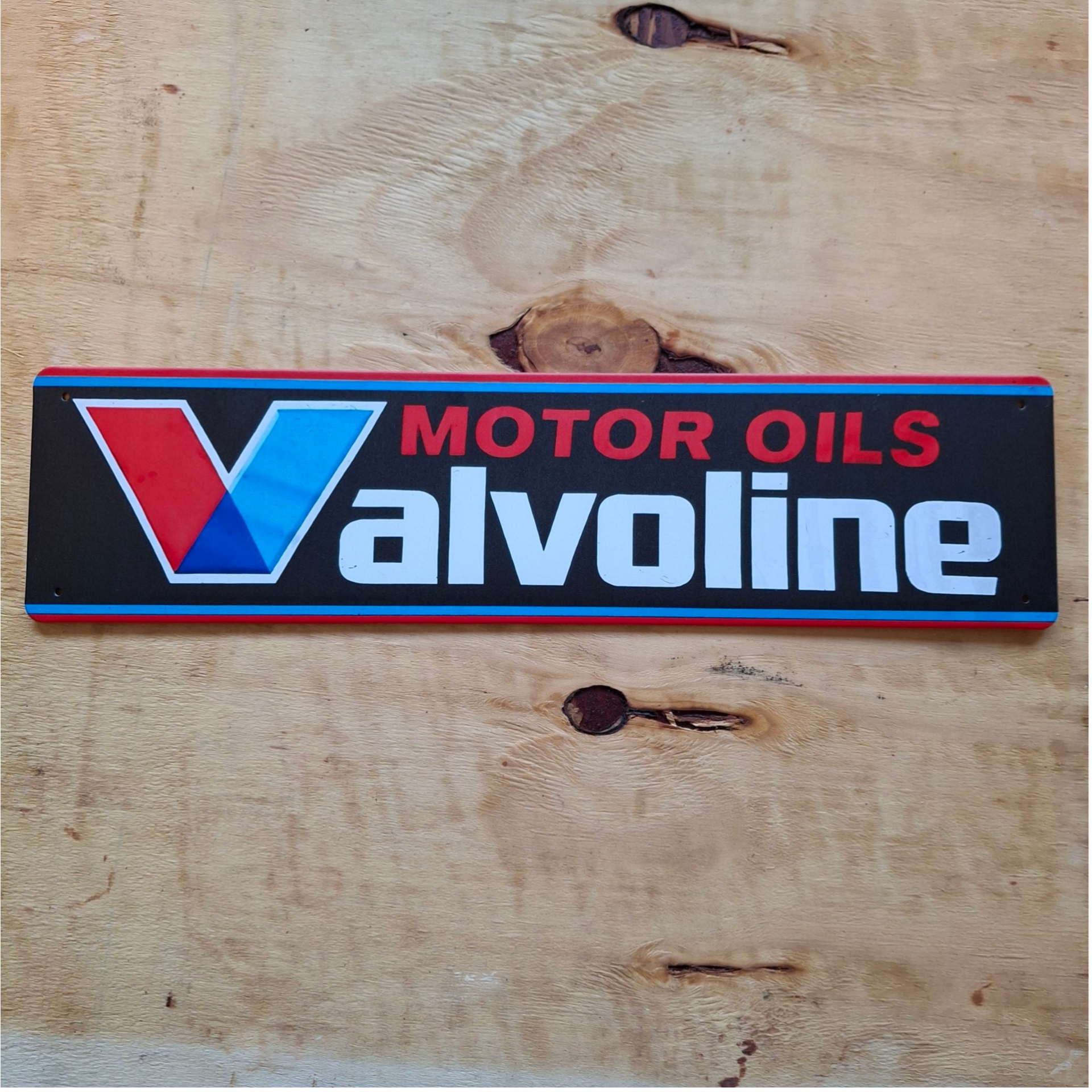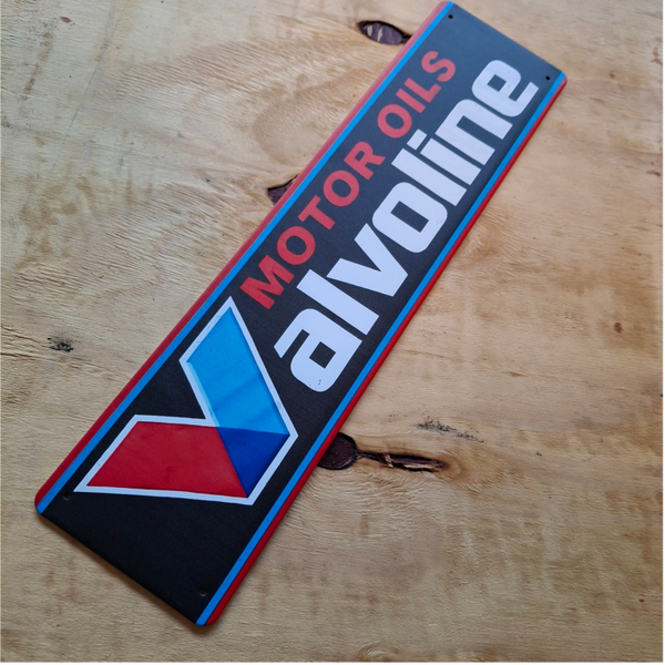 Metalen wandplaat van Valvoline Motor Oils. Afmeting is ongeveer 40 cm x 10 cm. Voorzien van 4 gaatjes om hem op te hangen.