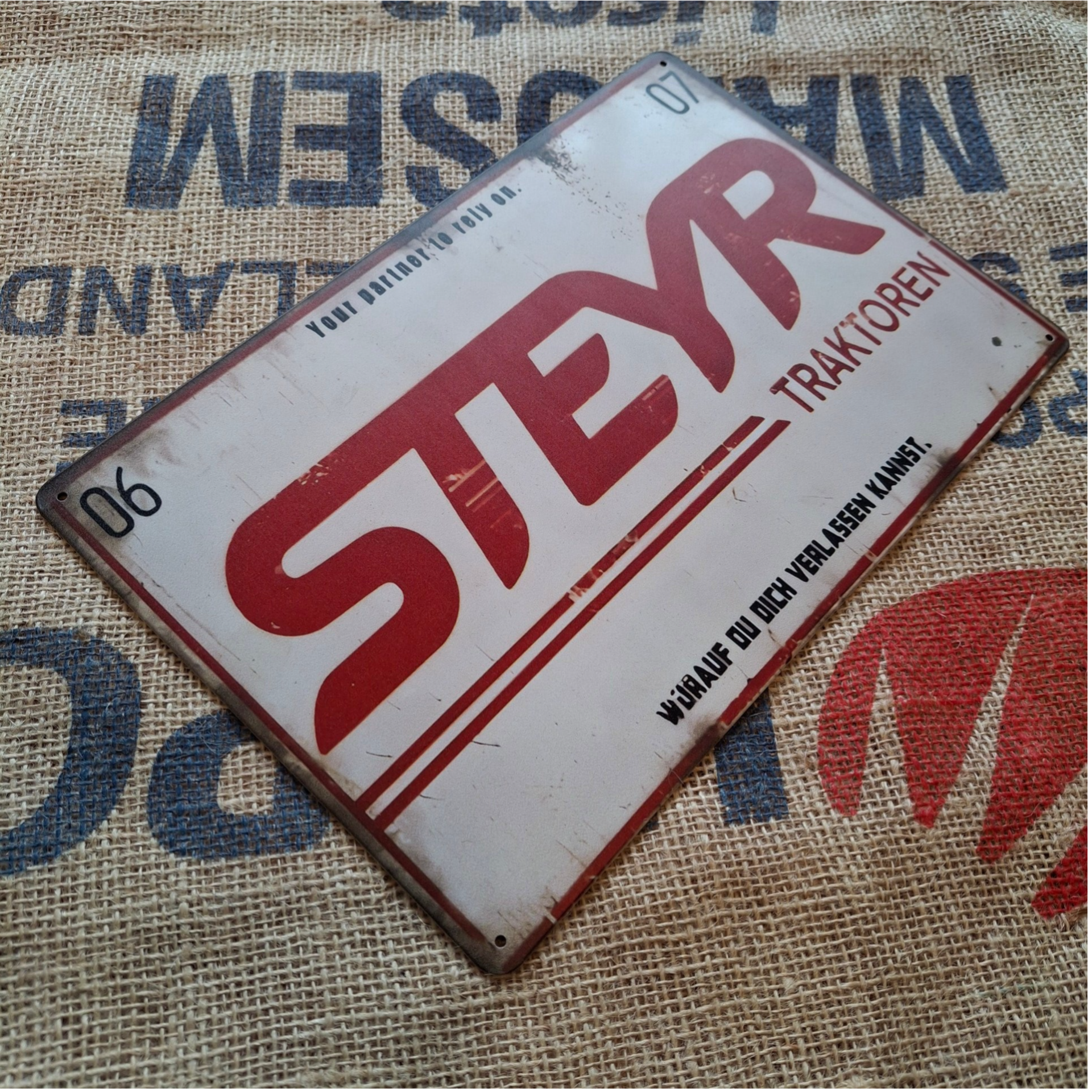 Metalen wandplaat van het Steyr logo. Afmeting is ongeveer 30 cm x 20 cm. Voorzien van 4 gaatjes om hem op te hangen.