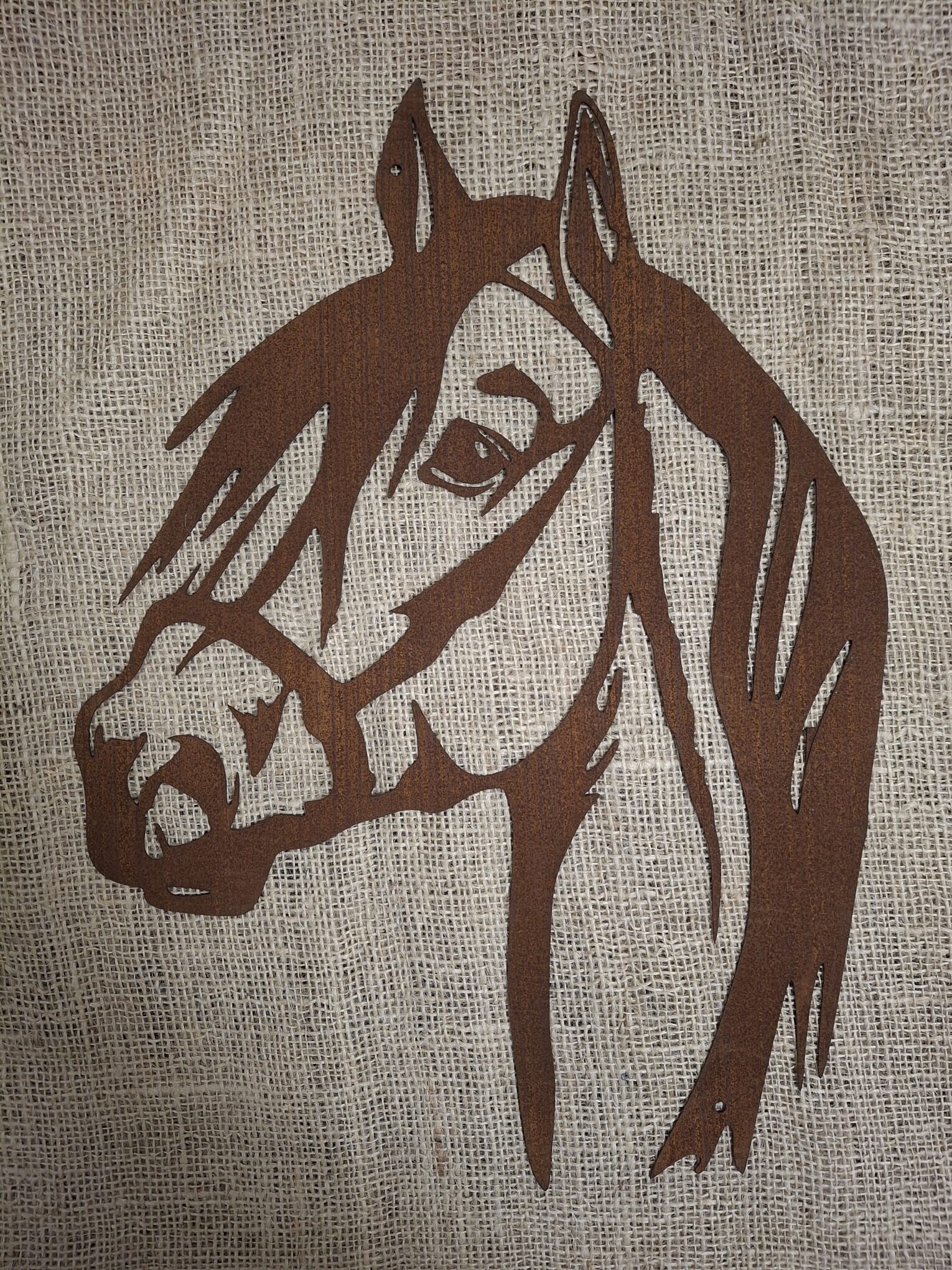 Uitgesneden paardenhoofd van roestig plaatstaal met een authentieke uitstraling. Het staal is ongeveer 1 mm dik en het paardenhoofd heeft een afmeting van ongeveer 40 cm x 30 cm.