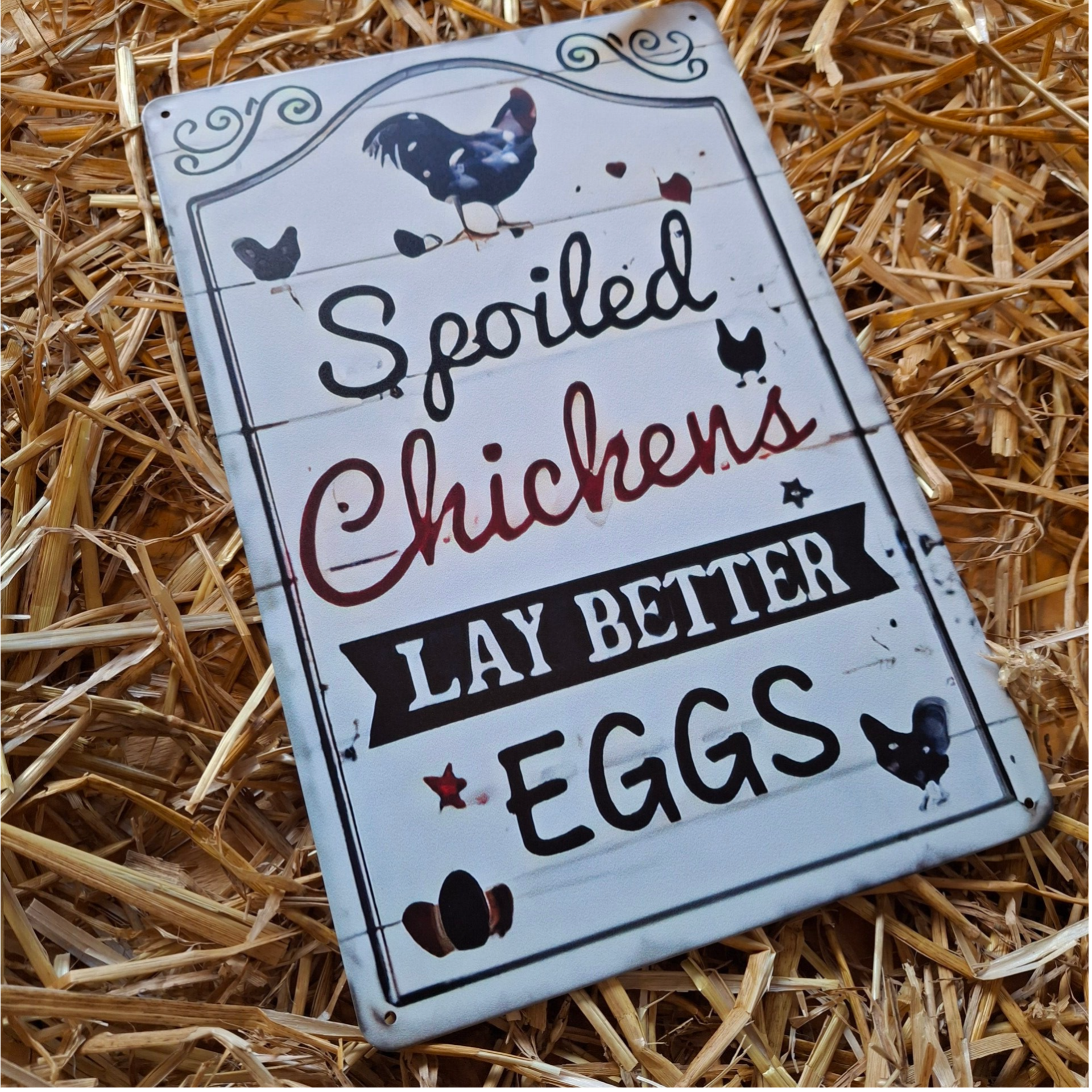 Metalen wandplaat met de tekst; 'Spoiled Chickens Lay Better Eggs'. Afmeting is ongeveer 20 cm x 30 cm. Voorzien van 4 gaatjes om hem op te hangen.