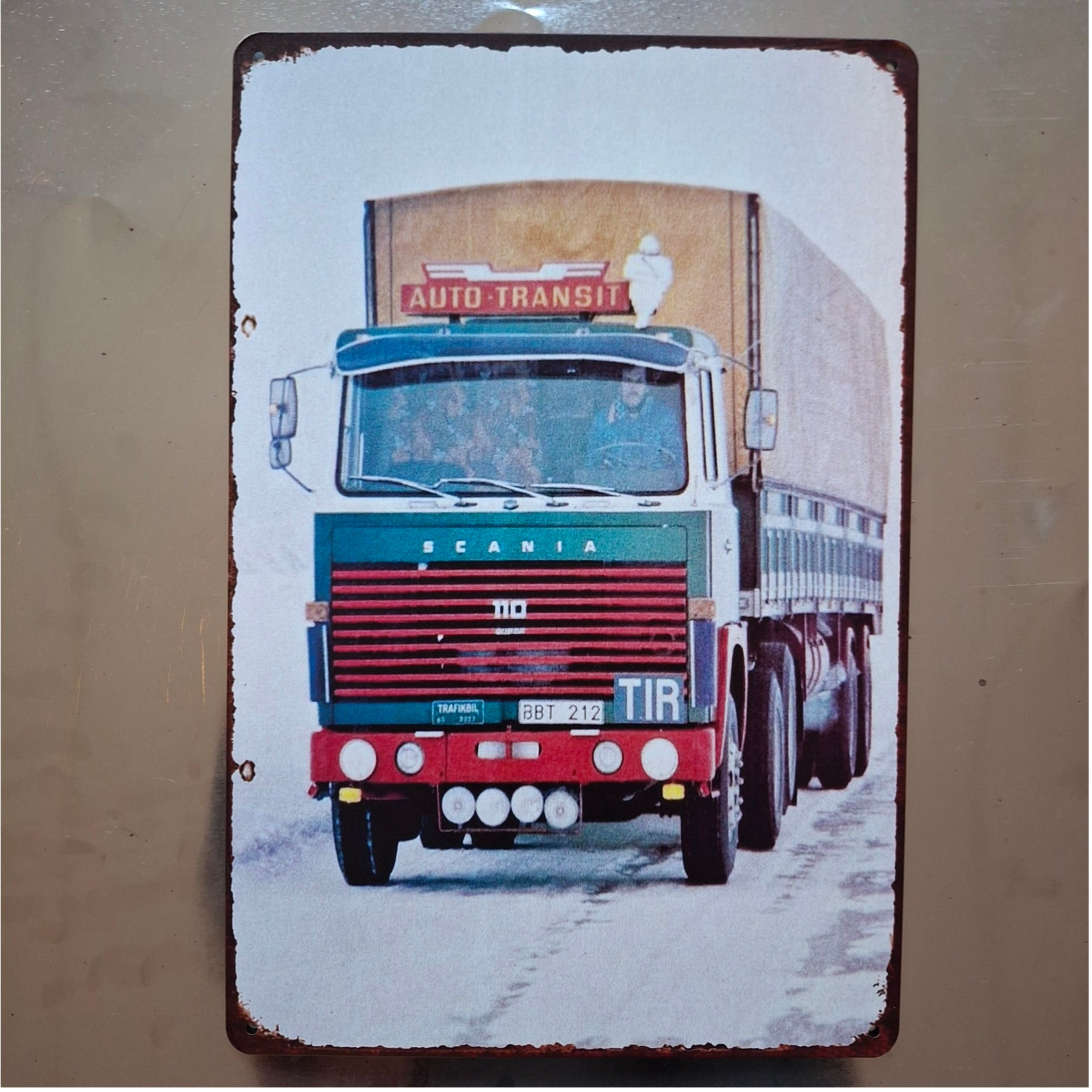 Metalen wandplaat van een Oldtimer Scania; Auto-Transit. Afmeting is ongeveer 20 cm x 30 cm. Voorzien van 4 gaatjes om hem op te hangen.