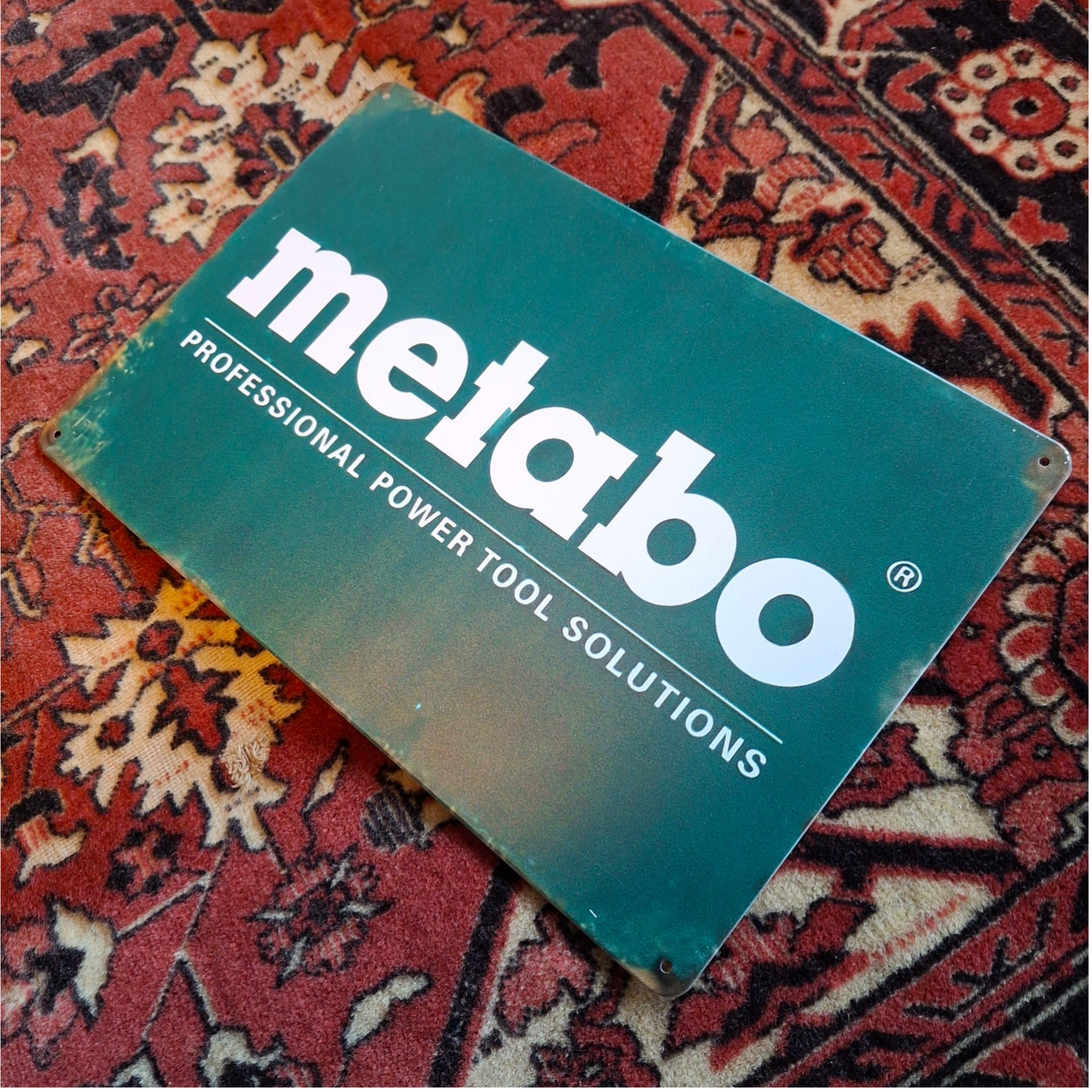 Metalen wandplaat van Metabo. Afmeting is ongeveer 30 cm x 20 cm. Voorzien van 4 gaatjes om hem op te hangen.
