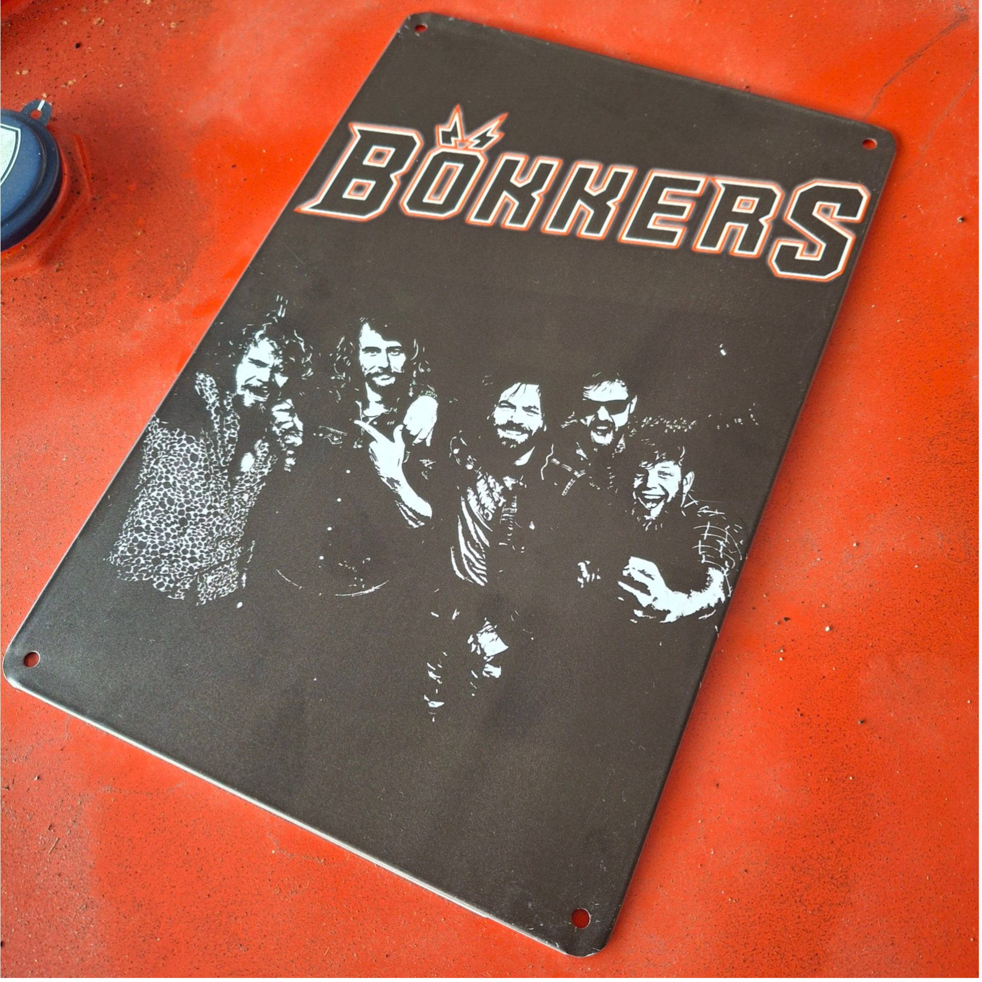 Metalen wandplaat van de band Bökkers in de huidige bezetting. Afmeting is ongeveer 20 cm x 30 cm. Voorzien van 4 gaatjes om hem op te hangen.