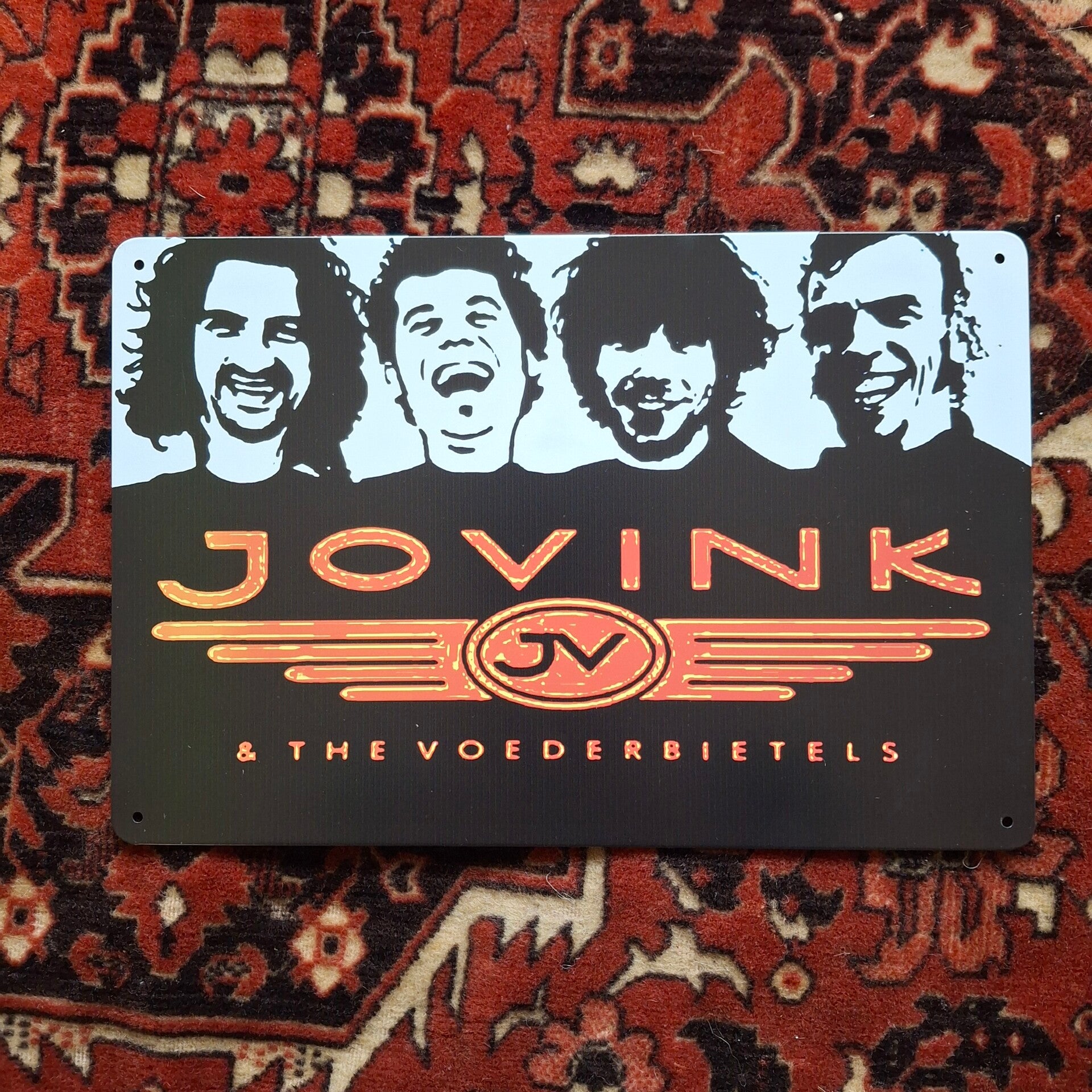 Metalen wandplaat van de band Jovink. Afmeting is ongeveer 30 cm x 20 cm. Voorzien van 4 gaatjes om hem op te hangen.