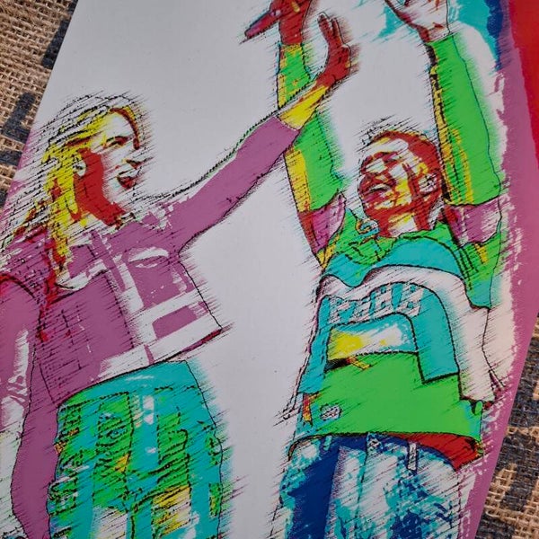 Metalen wandplaat van het populaire Pop-duo Suzan en Freek. Afmeting is ongeveer 20 cm x 30 cm. Voorzien van 4 gaatjes om hem op te hangen.