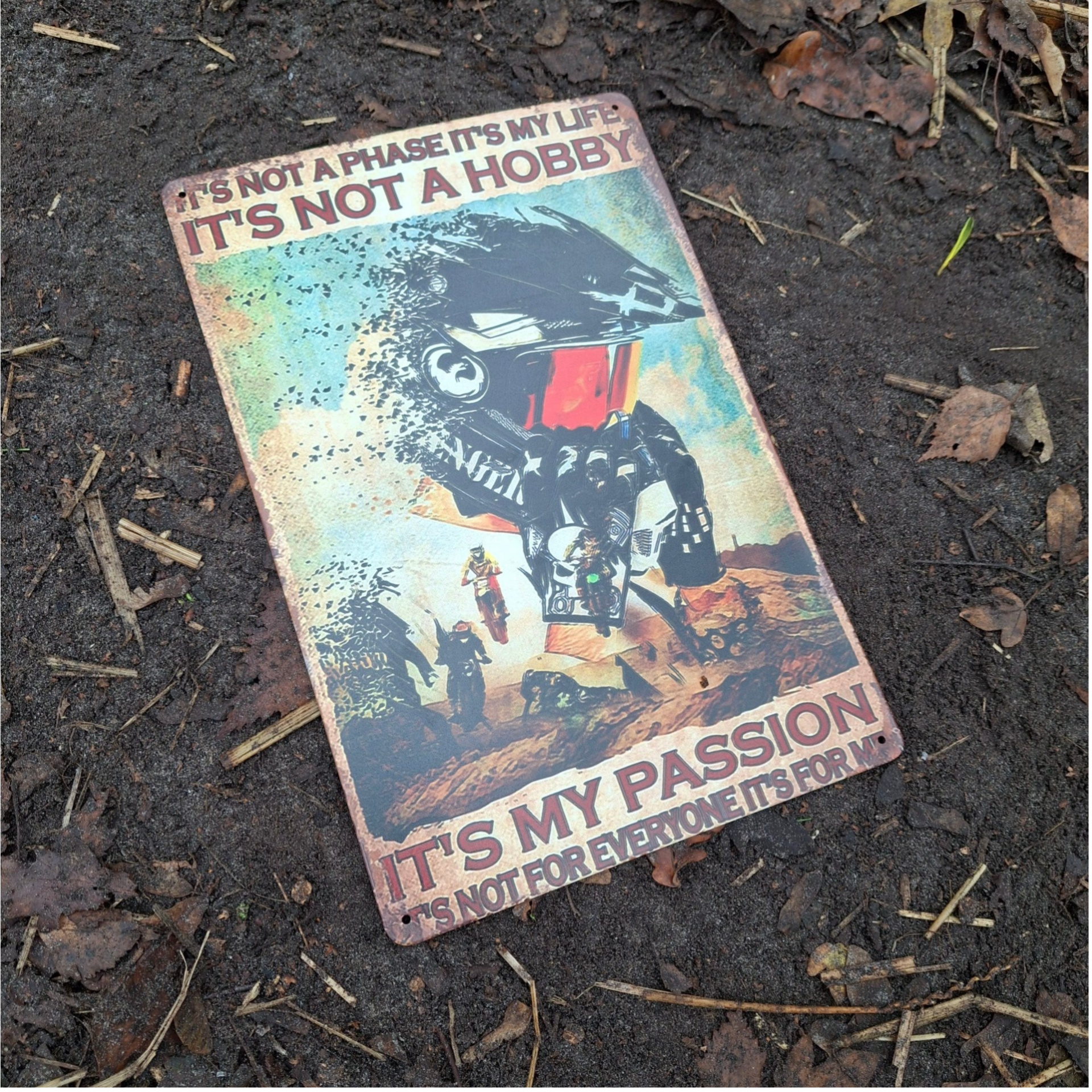 Metalen wandplaat van de Motorcross met tekst. Afmeting is ongeveer 20 cm x 30 cm. Voorzien van 4 gaatjes om hem op te hangen.